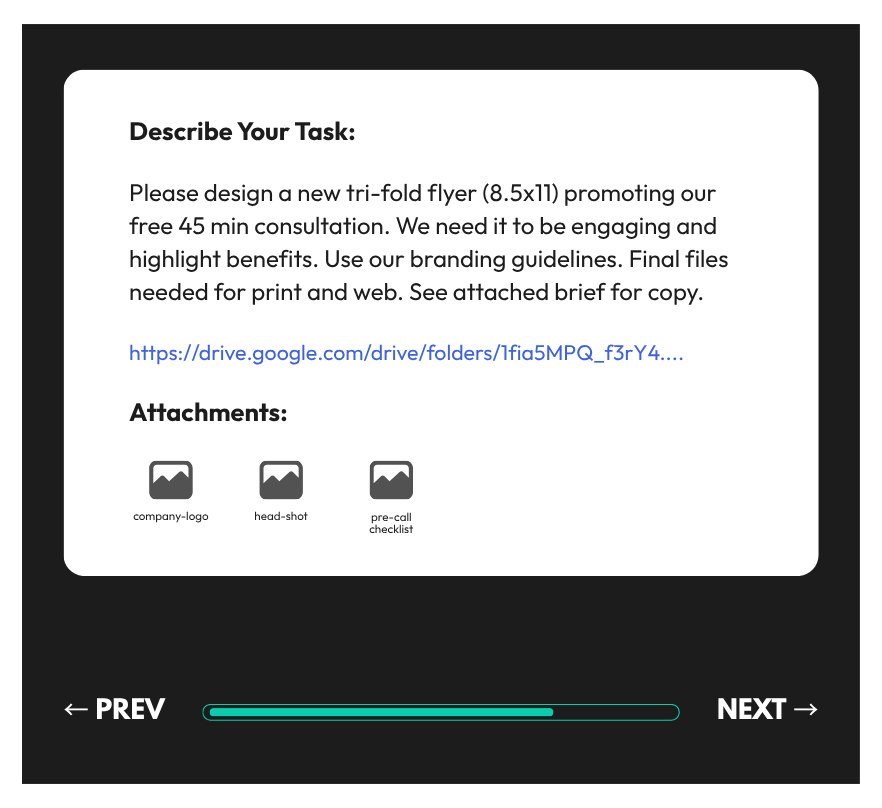 Tell us what you need. Use text, mockups, and/or Loom videos.